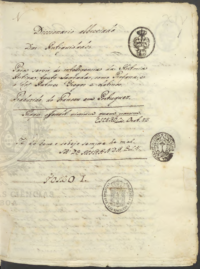 Para servir á intelligencia da Historia Antiga, tanto Sagrada, como Profana, e á dos Autores Gregos e Latinos. Traduzido do Francez em Portuguez".. No último fl., tem os seguintes despachos: "Imprima-se e volte a conferir. Meza, 25 de Fevereiro de 1779”, “Imprima-se e torne a conferir. Lxª, 17 de outubro de 1805", ambos com rubricas.. Original. Comprado pela Academia ao Autor (cf. Inocêncio, VI, p. 423).. Enc. com lombada e cantos de pele branca. Pastas de papel manchado. Entre os fls., alguns aditamentos escritos sobre fragmentos de papel..