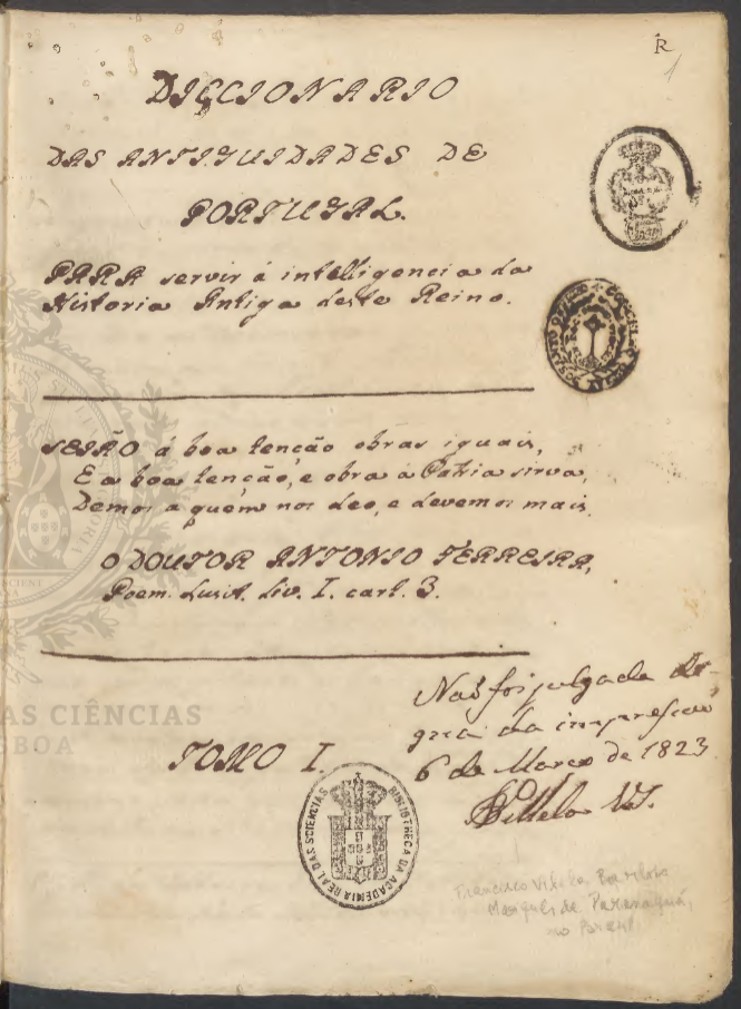 Original. No rosto do primeiro tomo lê-se o seguinte despacho: "Não foi julgada digna de impressão. 6 de Maio de 1823. F. B. S.ª”. No final (fl. 357v. e 358), encontram-se mais dois despachos: “Imprima-se appontadas as Leis respectivas notadas nos artigos da Cençura, e torne para se conferir. Lx.ª a 6 de Fevereiro de 1808” (com seis rubricas), e “vay com este Manuscripto o Extracto da censura, para à vista dele se observar a determinação do desp.º de 6 de Fevr.º de 1808".. Enc. com lombada e cantos de pergaminho e pastas de papel manchado. Compreende dois tomos encadernados juntos.. Adquirido pela Academia ao Autor (cf. Inocêncio, VI, p. 423).. Texto Integral (PDF, 91,3 MB)