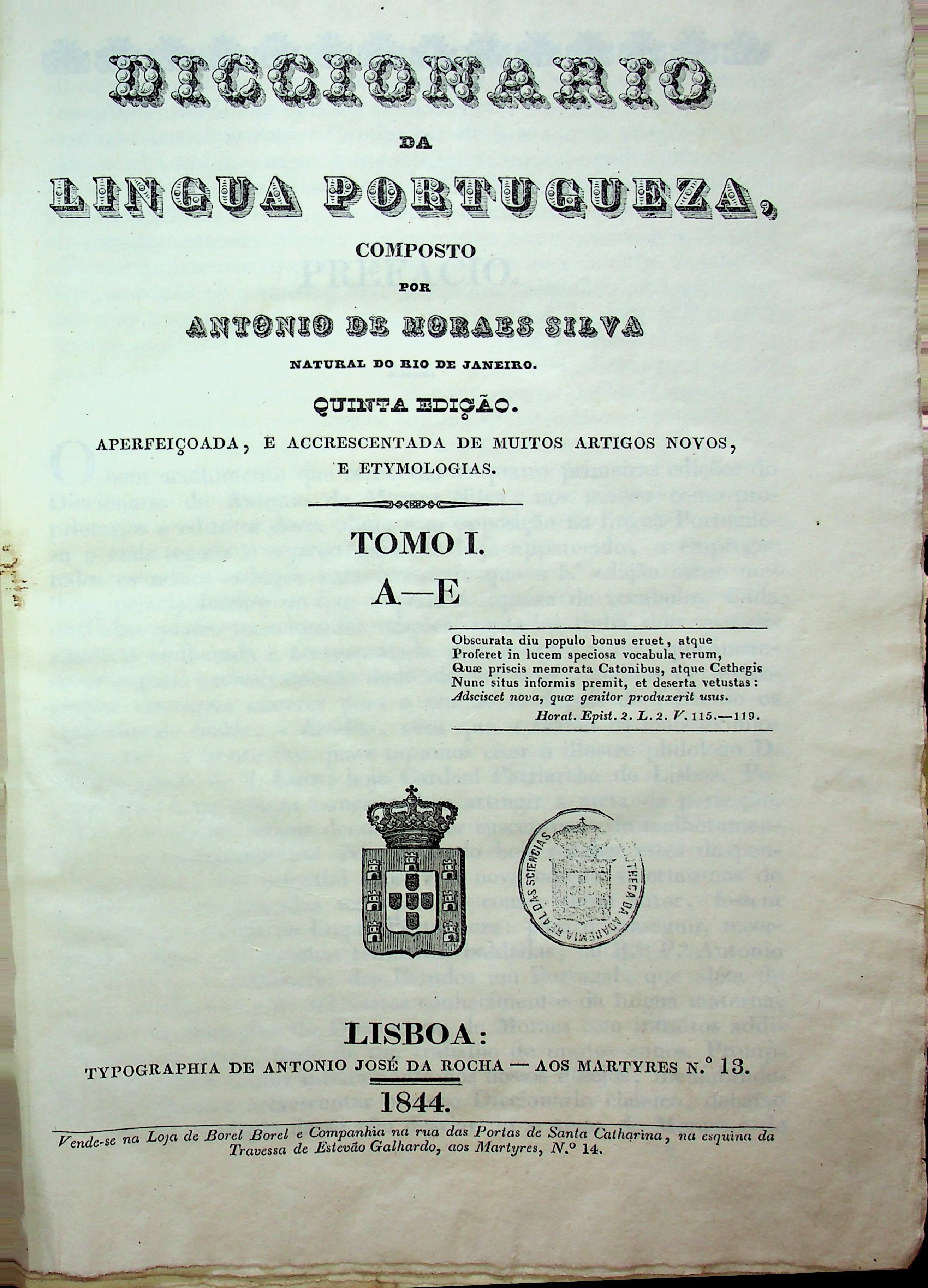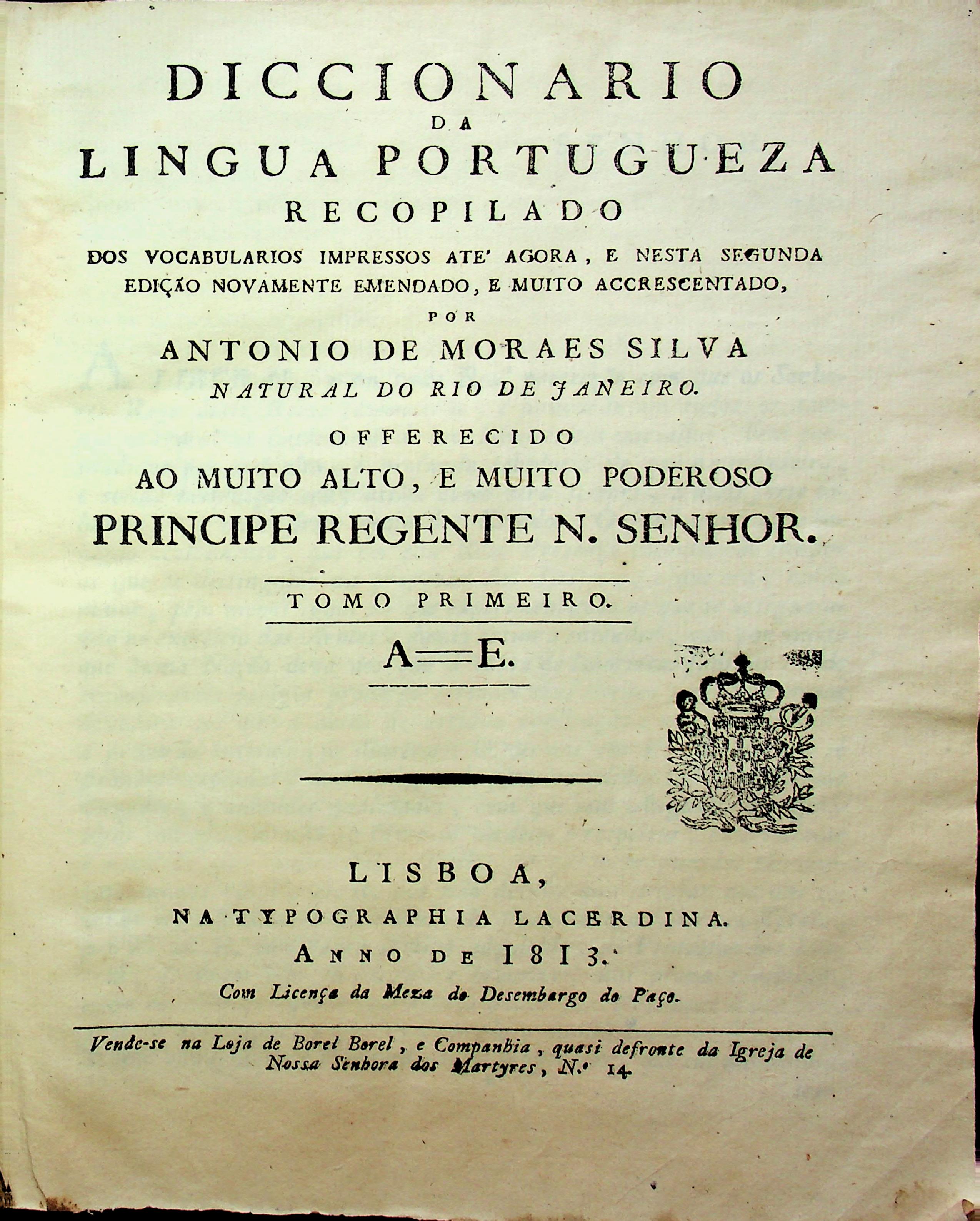 Relação de vocábulos de ABA a ZURZIR. O Diccionario da Lingua Portugueza, de António de Morais e Silva, foi publicado pela primeira vez em Lisboa, na Tipografia Lacerdina, em 1813. Inocêncio (I, P. 209-210) refere mais cinco edições. Original. Enc. com lombada e cantos em imitação de pergaminho. Pastas forradas de papel manchado. Falta a folha de guarda do rosto.