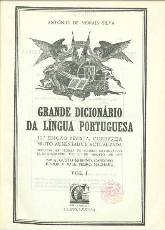 rev., corrigida muito aumentada e actualizada por Augusto Moreno, Cardoso Júnior, José Pedro Machado. 10ª ed. Título de cada volume retirado da lombada . Cot. Ant. : 15 cimalha M. de Faria. Na cota Av. C 18626, excetuando os vols. 2 e 4, todos os outros encontram-se repetidos.. Data de publicação dos volumes retirada do colofão. Pert. de: Marquês de Faria. v. I: A- Armadas, 1949. 1114 p.;. v. III: Cesto Desvalo, 1951. 1114 p.. volume com lombada danificada; . v. IV: Desvalora Eza, 1952. 1051 p.. volume com lombada danificada;. v. V: F Iridiar. 1045 p.. volume com lombada danificada; . v. VI: Iridico Moreáce, 1954. 955 p. . v. VII: Moreão Pebrina, 1954. 955 p. . v. VIII: Peça P. V., 1955. 897 p. . v. IX: Q Seive, 1956. 1003 p. . v. X: Seive Tomara., 1957. 955 p. . v. XI: Tomara Zurara, 1958. 905 p. . v. XII: Aditamentos. 1912 p.
