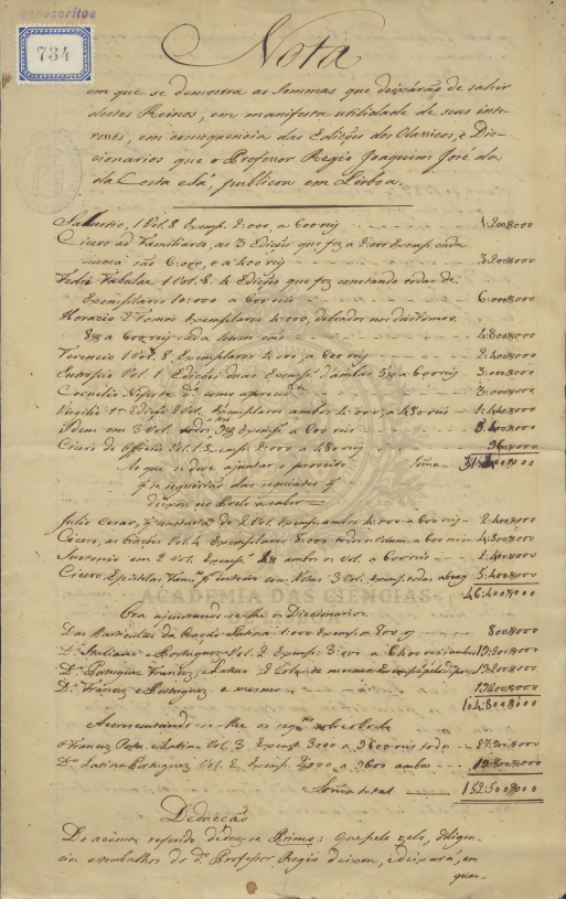Nota em que se demonstra as sommas que deixárão de sahir destes Reinos, em manifesta utilidade de seus interesses, em consequencia das Edições dos Classicos, e Diccionarios que o Professor Regio Joaquim José da Costa e Sá, publicou em Lisboa