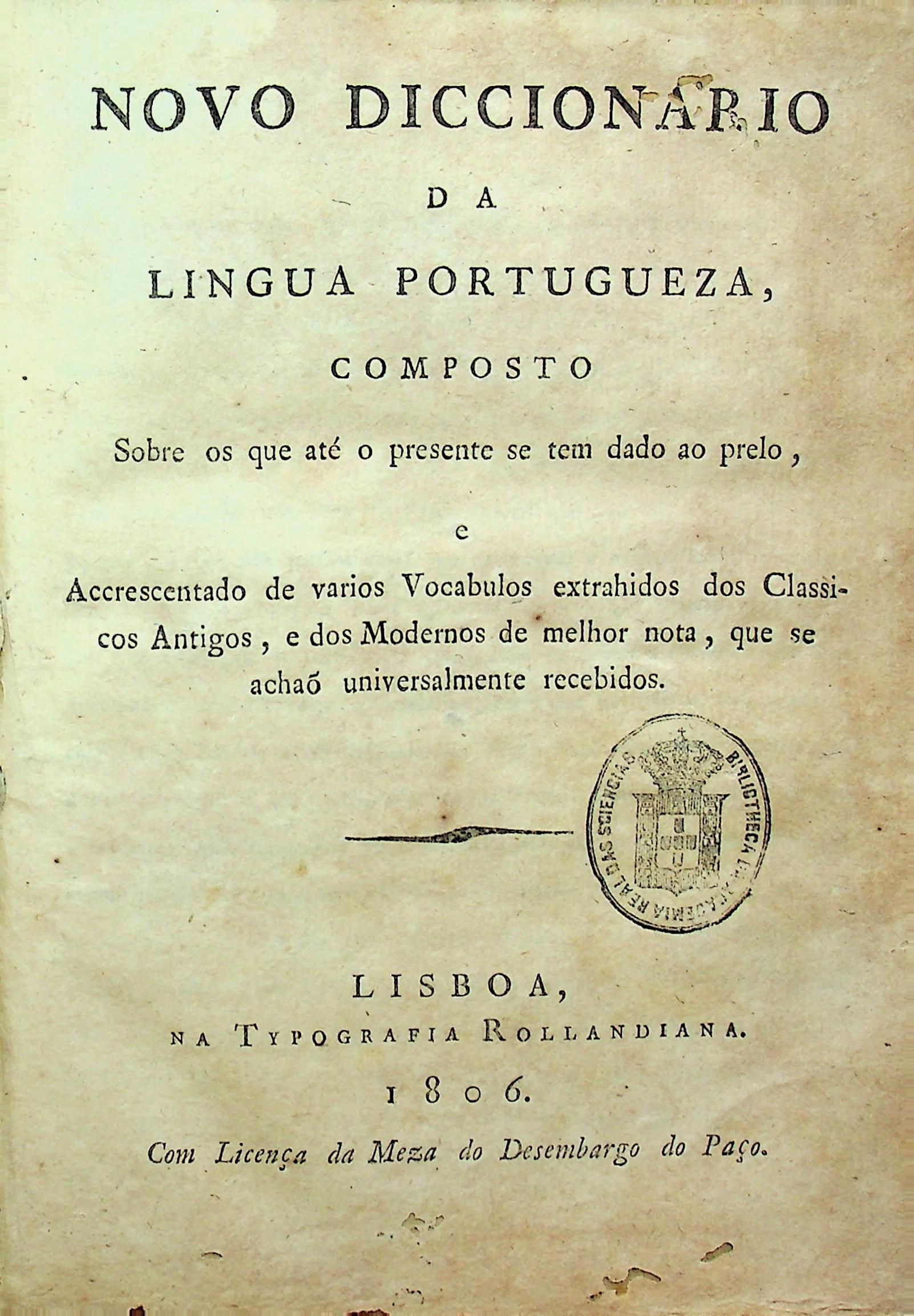 Novo diccionario da lingua portugueza: composto sobre os que até o presente se tem dader ao prelo, e accrescentadode varios vocabulos extrahidos dos classicos antigos, e dos modernos de melhor nota, que se achaõ universalmente recebidos